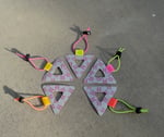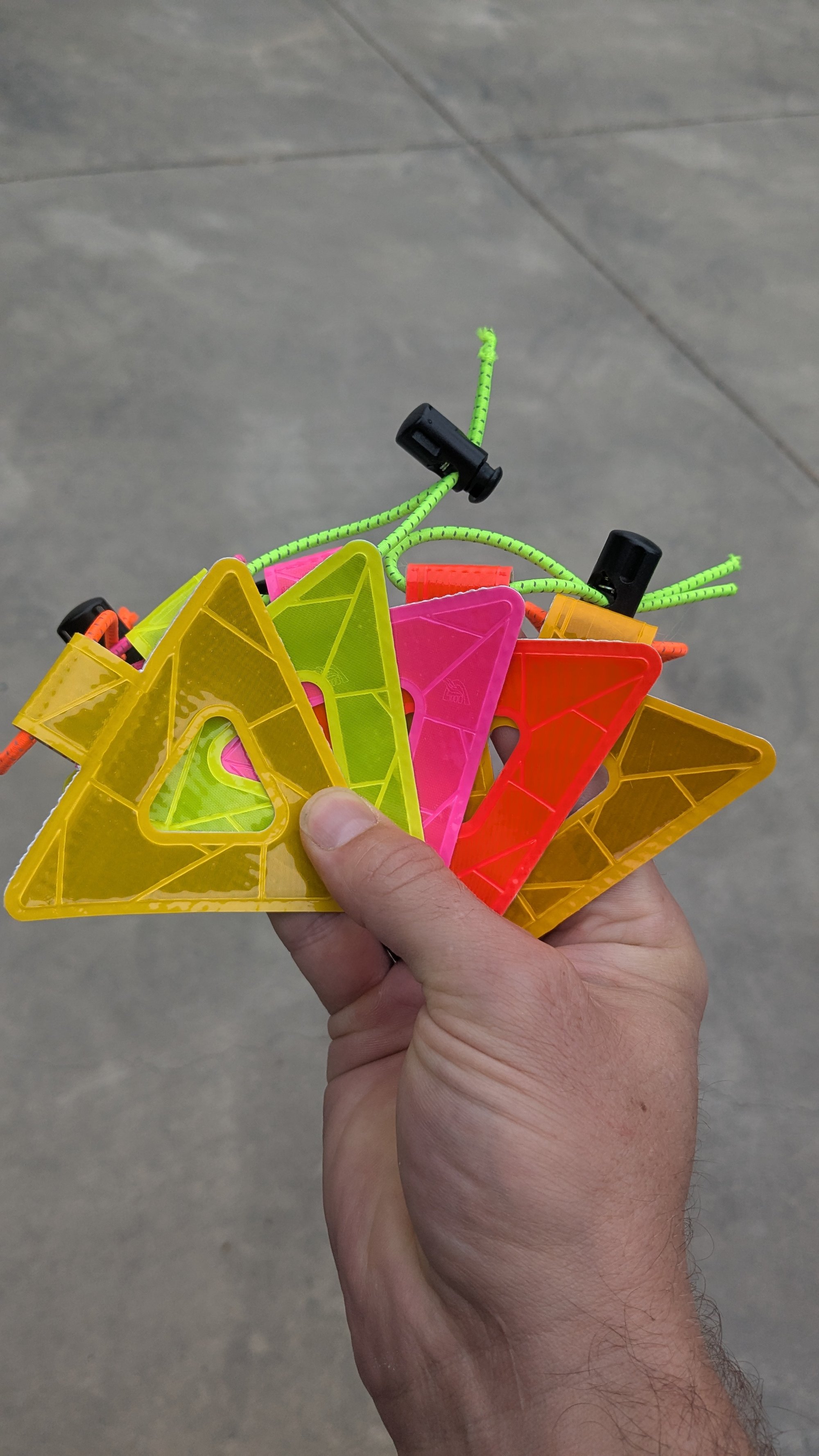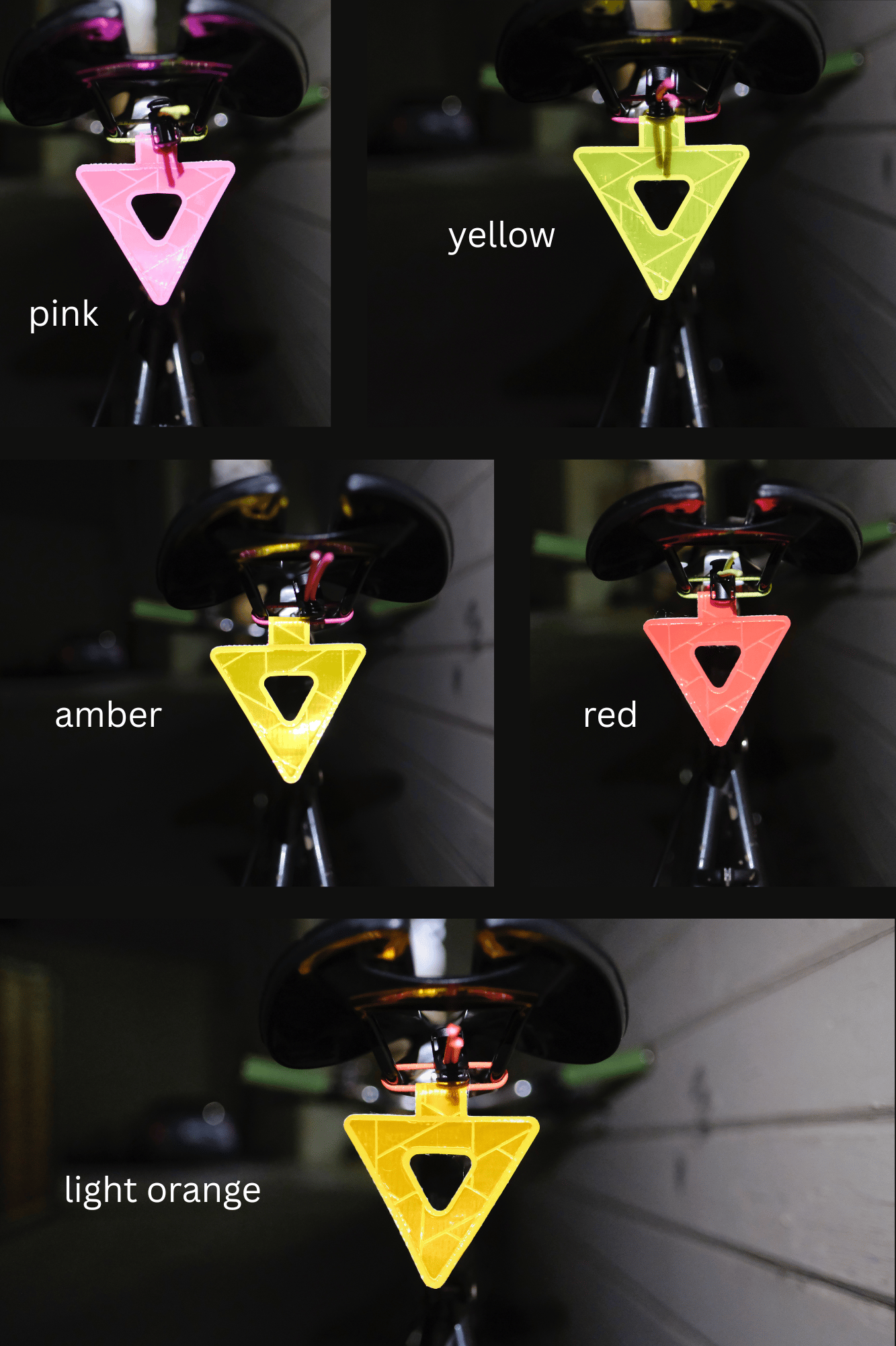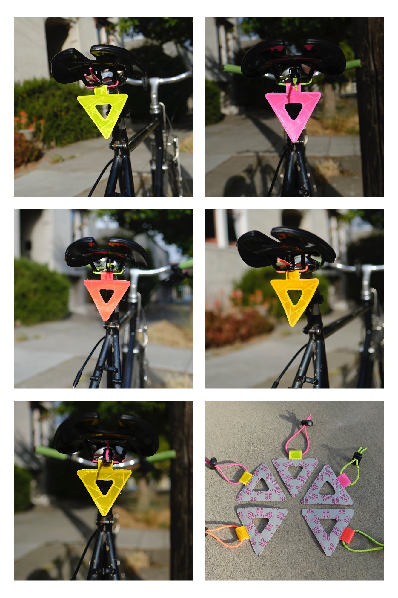 This is the V2 Prismatic Welded Visto. It is an extremely reflective and vibrantly visible safety triangle made with prismatic PVC on a rubberized backing. Prismatic PVC contains thousands of microscopic prisms that act like tiny mirrors which direct most light back to its source with minimal loss (driver eye balls ideally). The material is extremely bright and there's a good reason this is used in construction environments. Now you can have it on your bike! These were designed in Oakland, CA and welded in China.